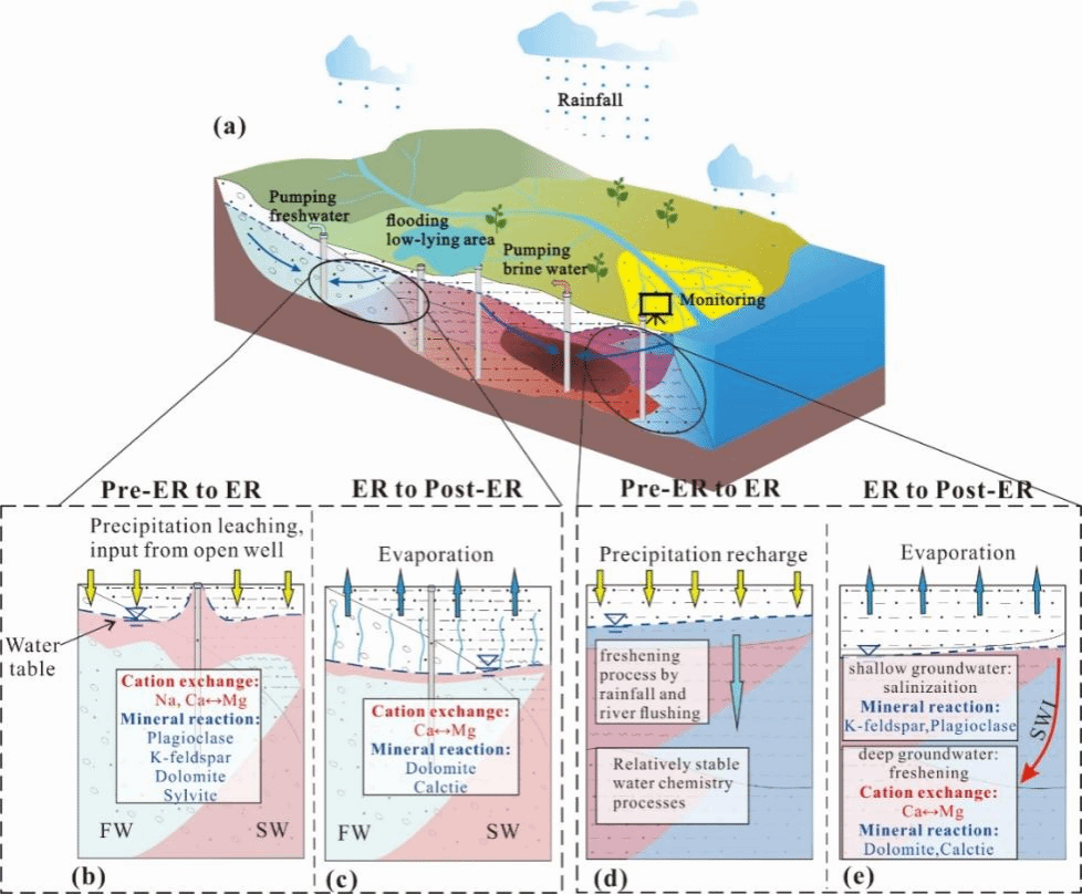 研究发现极端降雨重塑了地下水系统水动力格局,直接改变了地下水的补给路径与径流过程,进而导致水化学成分发生剧烈变化;指出了极端降雨事件通过触发活塞流效应,驱动雨水快速下渗,是引起地下水化学成分短期内显著变异的核心物理机制;应用多元混合模型成功揭示在降雨胁迫下地下水系统补给端元(包括雨水、淡水、咸水、海水和卤水)的数量和贡献均发生显著动态变化,并发生复杂的水化学过程(阳离子交换、矿物溶解沉淀)。上述水动力过程与水化学过程在时空尺度上呈现显著差异性,充分凸显了沿海地下水系统固有的高度动态性及其在气候变化扰动下所展现的韧性特征。