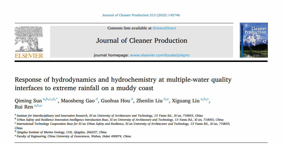 近日,交叉创新研究院韧性城市规划工程研究院团队与青岛海洋地质研究所联合完成的研究成果“Response of hydrodynamics and hydrochemistry at multiple-water quality interfaces to extreme rainfall on a muddy coast(泥质海岸带多水质界面对极端降雨的水动力水化学响应过程研究)”发表在国际著名期刊Journal of Cleaner Production (中科院一区TOP,2024年影响因子为10.0)上。我校为论文第一完成单位,交叉创新研究院助理教授孙启明为论文第一作者。