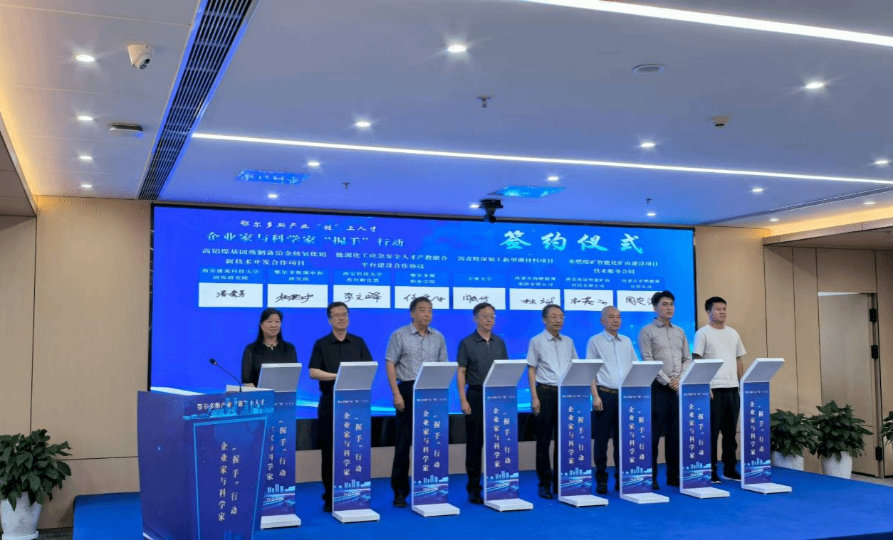 活动设置合作项目签约、院士工作站与重点实验室授牌、人才科创飞地揭牌、“技术攻关需求”和“可落地转化成果”双向发布等环节。集中促成包括我校“高铝煤基固废制备冶金级氧化铝新技术开发合作项目”在内的8项校企合作项目签约(图2)、4家院士工作站与4家自治区重点实验室授牌以及3个“科创飞地”落地。市科技局三级调研员王所豪面向制造业、能源、煤化工、装备制造等重点产业发布“技术攻关需求”清单。其中,鄂尔多斯对粉煤灰、煤矸石等煤基固废高值化利用的迫切需求,与我院“高铝煤基固废制备冶金级氧化铝”新技术开发项目高度契合。项目落地有助于解决当地煤基固废无害化、减量化与高值化利用难题,开启校企合作共赢新局面,为鄂尔多斯地区打造千亿级氧化铝产业集群提供科研支撑(图3)。