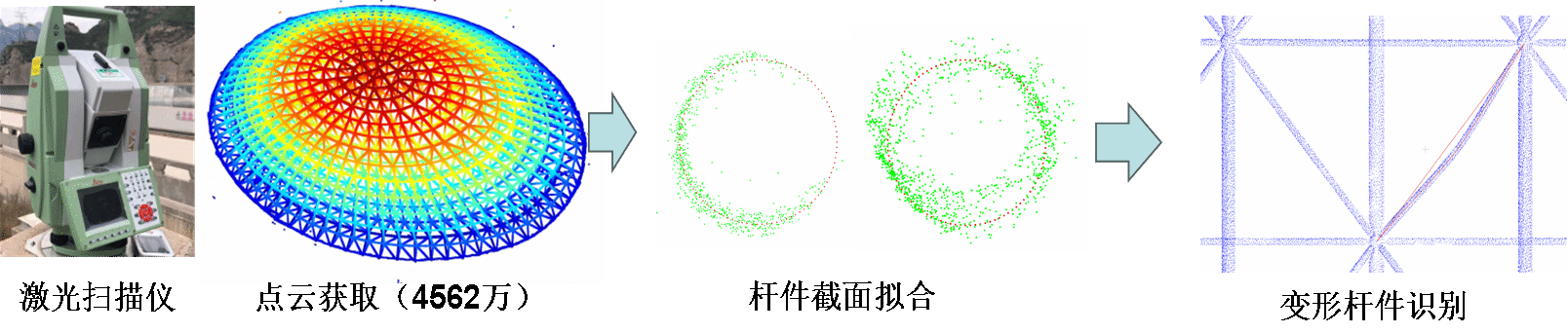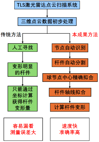 针对上述问题,本成果研发了一套基于激光点云的结构变形识别及力学状态反演方法技术。该技术首先通过三维激光扫描仪快速获取结构的全域高精度点云数据,形成结构的点云模型。