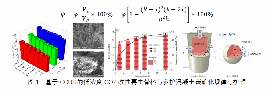 开展了基于模拟烟气CO2的混凝土碳矿化养护试验,分析了低浓度CO2对混凝土基体放热特性及微观结构的影响,发现并揭示了低浓度CO2养护混凝土获得更高固碳率与硬化强度的增强规律与机理。考虑CO2养护过程中液固扩散与碳矿化反应密实化的影响,建立了低浓度CO2养护混凝土的固碳率计算模型。