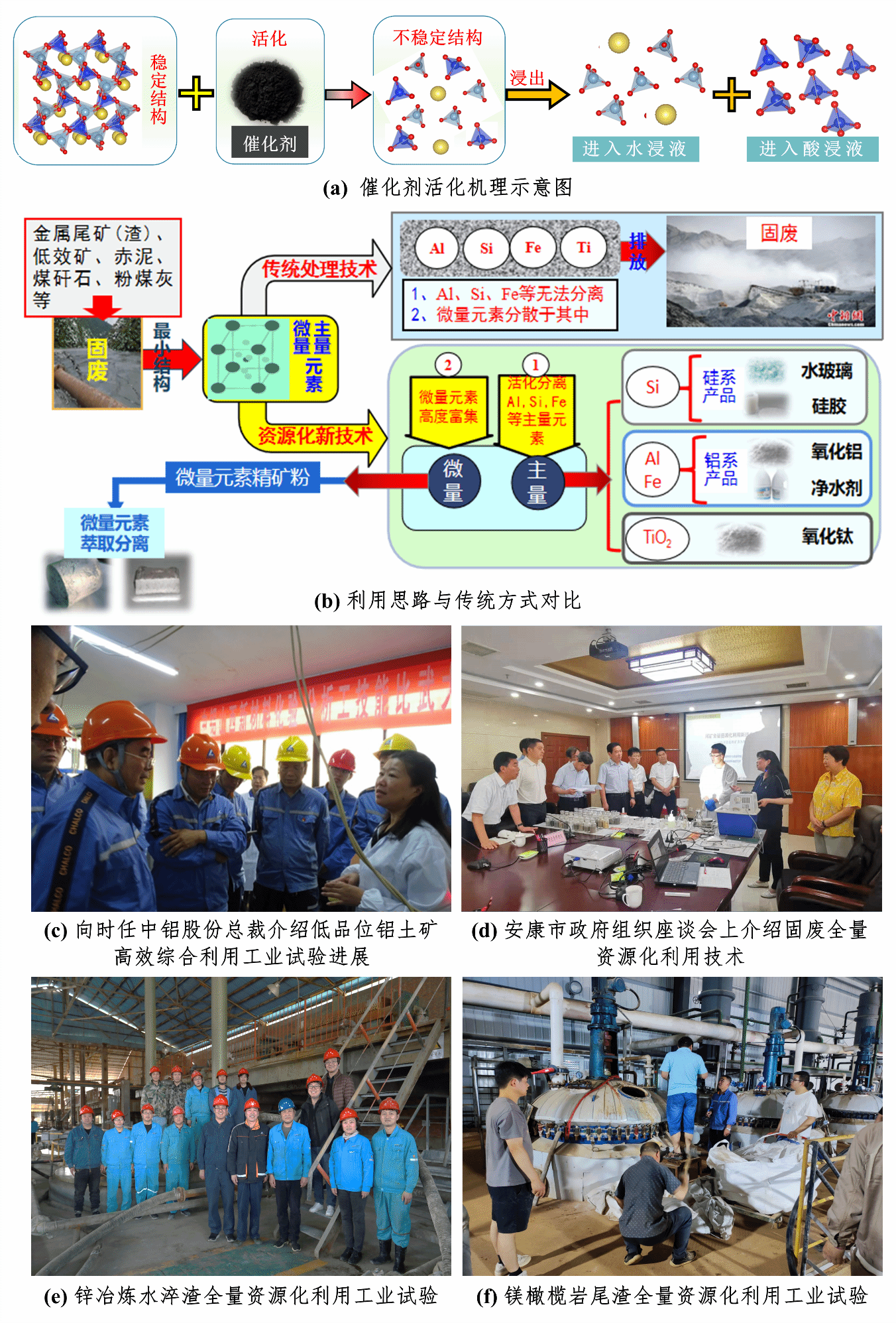 针对国内外当前固废处理利用中存在的成本高、无害化与减量化效果不佳、资源化率低、二次固废排量大、经济效益低等问题,研究团队基于“减量化、资源化和无害化”原则,开展了系统研究并取得颠覆性突破。在对固废持续研究的基础上,通过地球化学与冶金学的交叉,提出“冶金地球化学”新观点,并在思路上,突破了对固废“沙里淘金”式利用的传统模式,开创了“取沙留金”式新路径;技术上,开发出了“催化活化”技术及配套工艺,能够在低能耗、低成本条件下,将固废中的主量元素(“沙”)、微量元素(“金”)全部分离、转化为高附加值产品,实现了对固废的全量资源化高效利用。目前已获得国家授权发明专利30余项,成果居国际领先水平。