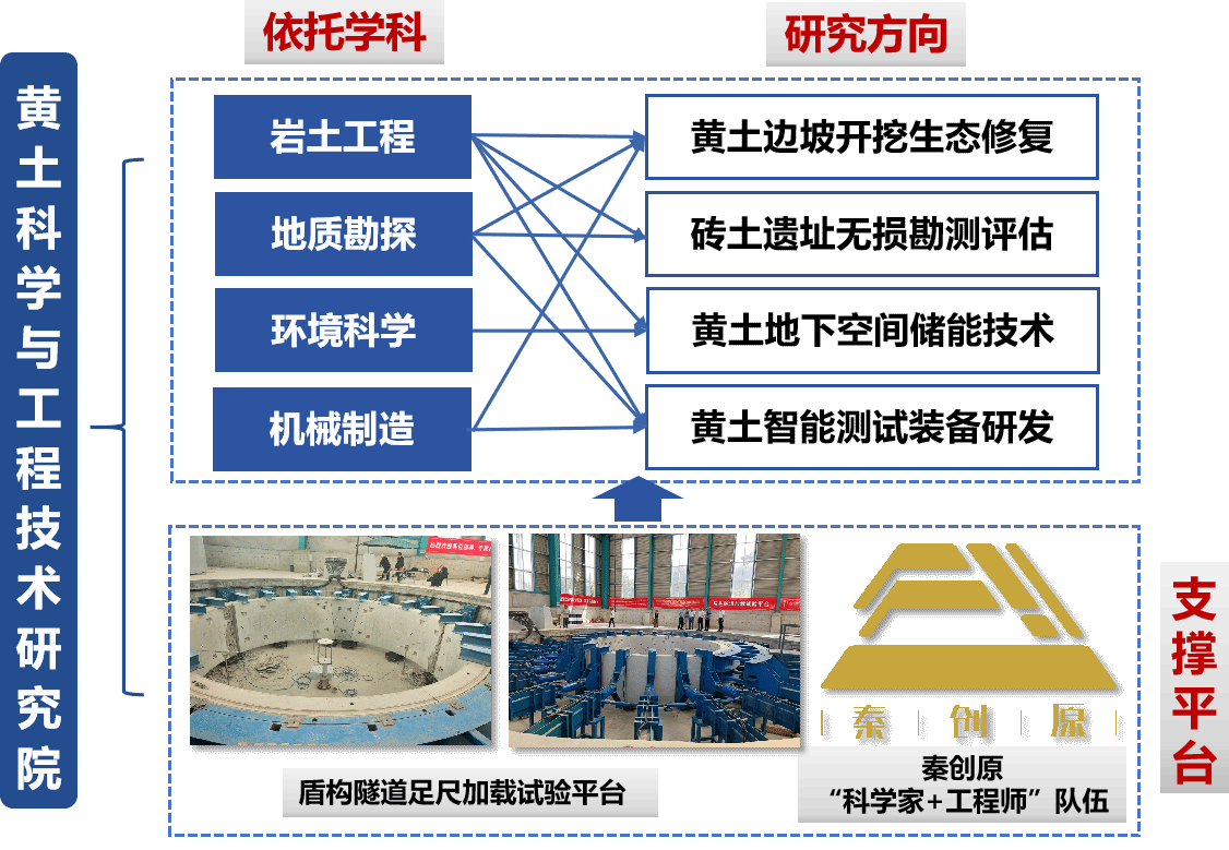 黄土科学与工程技术研究院(以下简称黄土院)作为西安建筑科技大学依托全国A类学科土木工程建设的跨学科实体科研机构,于2023年正式揭牌成立。黄土院以交叉创新研究院为平台,由全国工程勘察设计大师郑建国教授领衔,聚焦我国黄土地区重大工程需求,整合岩土工程、建筑学、矿业工程、安全科学与工程、计算机科学与工程及材料工程等多学科资源,重点围绕复杂黄土地基处理、地下空间绿色建造与智慧运维、岩土智能测试装备研发、抽水蓄能电站岩土工程技术等前沿领域开展科研攻关,开展生态岩土工程、智能岩土工程、能源岩土工程等交叉方向研究,推动黄土工程从传统技术向生态化、智能化、可持续化转型。