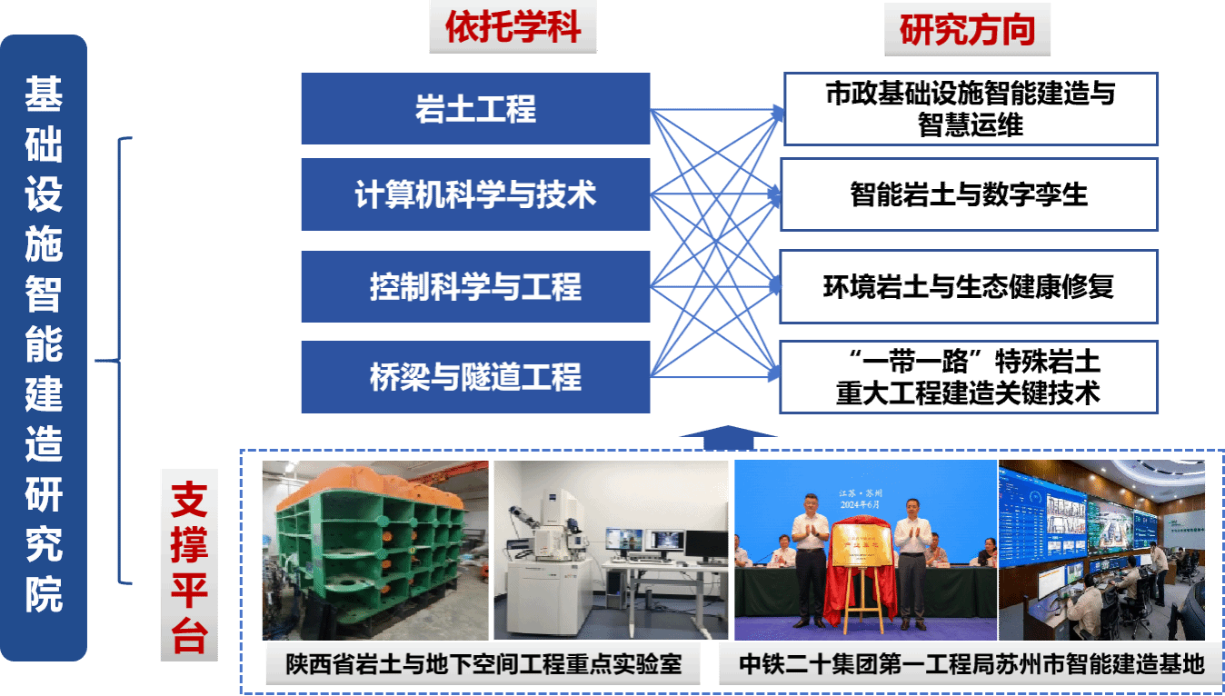 基础设施智能建造研究院(以下简称基智院)是校企合作背景下,由西安建筑科技大学与中铁二十局集团第一工程有限公司联合成立的研究机构。基智院围绕国家“一带一路”倡议、交通强国战略及“十四五”基础设施规划,聚焦城市基础设施及西部高原交通基础设施重大工程建设需求,联合中铁二十局、中铁建大桥局等龙头企业,瞄准重大基础设施全生命周期智能建造关键科学问题,重点推进“一带一路”沿线国家基建合作,融合学校岩土、信息控制、桥隧工程等学科优势,瞄准重大基础设施全生命周期智能建造关键科学问题,面向市政基础设施智能建造与智慧运维、智能岩土与数字孪生、环境岩土与生态健康修复、“一带一路”特殊岩土重大工程建造关键技术等方面开展应用基础研究及技术研发工作。