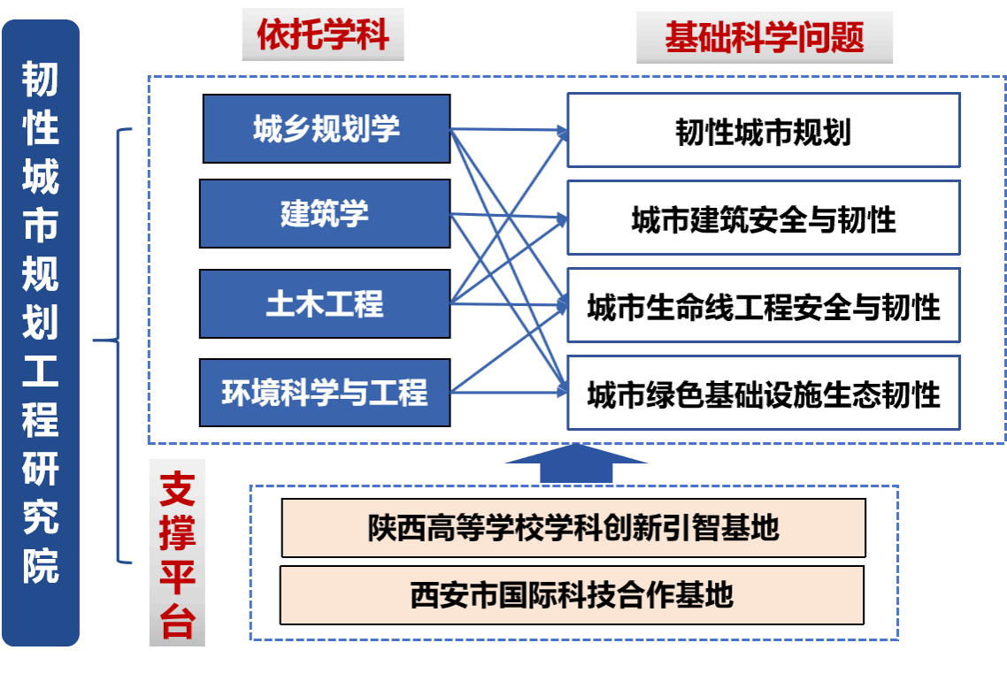 韧性城市院是以服务韧性城市建设为目标,以提升城市抗风险能力为导向,发展具有科学防灾、韧性恢复的未来城市规划管理体系而成立的国际化研究机构。韧性城市院与学校土木工程学院、建筑学院相关学科全面深度交叉融合,立足西北,面向“两高一疆、一河一城”地区,围绕国家韧性城市建设需求,弘扬中国本土城市韧性营造智慧,借鉴国际前沿韧性城市规划理论,深化“城市规划工程”学科链群的交叉创新。已形成了韧性城市规划工程、城市建筑(群)安全与韧性提升、城市生命线工程安全与韧性提升、城市生态韧性等四个布局前沿、特色鲜明的研究方向,各研究方向相辅相成,致力推动土木工程、城乡规划学、建筑学、水利工程、环境科学与工程、计算机科学与工程等学科交叉融合创新,重点开展科学防灾、韧性恢复的未来城市规划管理体系研究,承担韧性城市建设领域科学研究、人才培养、社会服务和学术传播等任务。